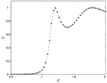 ![]() Figura 2. Coeficiente de transmissao para o potencial barreira retangular, (asteriscos) soluçao numérica da Eq. (8), (linha tracejada) soluçao analítica
