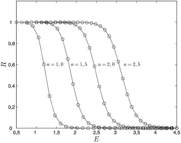![]() Figura 4. Coeficiente de reflexao R para o potencial de Eckart para diferentes valores de a com b = 8a, (linha contínua) exato, (círculos) soluçao numérica