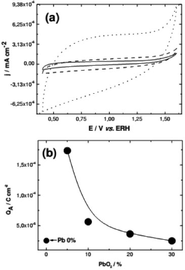![]() Figura 2. (a) Voltamogramas cíclicos de (-) Ti/TiO2; (…) Ti/Pb0,05Ti0,95O2 e (---) Ti/Pb0,10Ti0,90O2, (b) Variação da carga anódica (QA - C cm-2) em função da composição do eletrodo. Em ambos os casos eletrólito suporte: 0,10 mol dm-3 Na2SO4 e v = 50 mV s-1.