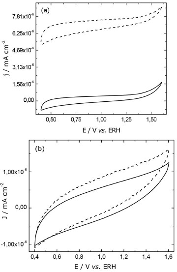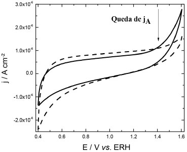 ![]() Figura 4. Voltamogramas cíclicos de Ti/TiO2 em (-) 0,10 mol dm-3 Na2SO4 e (-·-) 0,10 mol dm-3 Na2SO4 + 0,10 mol dm-3 formaldeído. Ambos os casos: v = 50 mV s-1