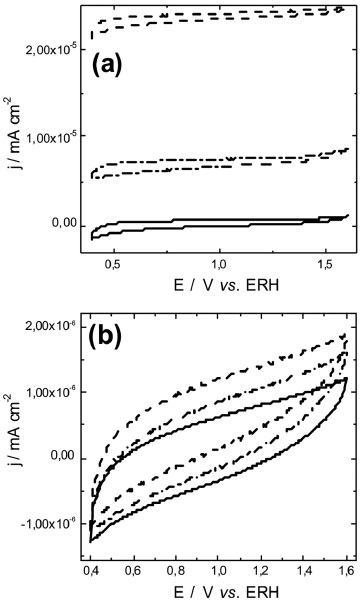 ![]() Figura 5. Voltamogramas cíclicos de (a) Ti/TiO2 e (b) Ti/Pb0,10Ti0,90O2 em (-) 0,1 mol dm-3 Na2SO4 + 0,10 mol dm-3 formaldeído sem luz; (-·-) 0,10 mol dm-3 Na2SO4 com luz e (---) 0,1 mol dm-3 Na2SO4 + 0,10 mol dm-3 formaldeído com luz, com v = 50 mV s-1