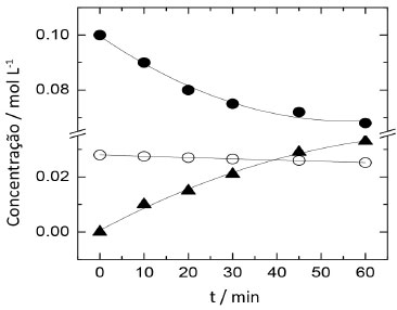 ![]() Figura 6. Perfil da concentração vs. tempo para a degradação de soluções de formaldeído-metanol a 2.0 V vs.ERH. Sendo que: (●) formaldeído, (○) metanol e (▲) ácido fórmico