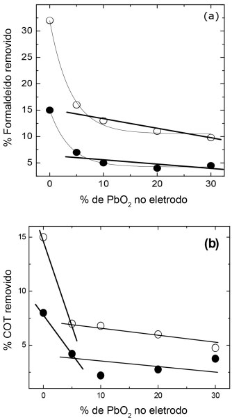 ![]() Figura 7. (a) Extensão da remoção de formaldeído e (b) Extensão da remoção de COT, ambos em função da composição do eletrodo. Potencial de eletrólise 2,0 V vs. ERH, onde, (○) degradação foto-assistida e (●) degradação eletroquímica