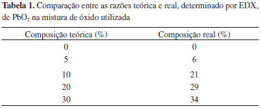 Nas análises de EDX são observados os picos correspondentes ao Ti e, onde foi incorporado, Pb. Observa-se o oxigênio em todos os espectros e também pode ser constatada a presença de pequenas quantidades de Cl devido à sua presença na mistura precursora (TiCl2). Adicionalmente pode-se observar, que as razões de Ti:Pb se alteram conforme suas razões nos precursores. Quantitativamente, é constatado que estes materiais apresentam um enriquecimento de Pb, como pode ser observado na Tabela 1. Estas observações são consistentes com dados publicados pelos autores,36 onde o enriquecimento por Pb é observado para eletrodos de composição Ti/Ru0.3Pb(0.7-x)TixO2. De acordo com estes autores,36 o Pb enriquece a superfície, assim, possívelmente blindando a presença de Ti.