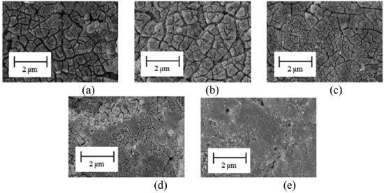 Figura 1. Imagens de MEV dos eletrodos de composição nominal Ti/PbXTi1-XO2. Mag: 5000 x. Razão teórica de PbO2 (a) 0; (b) 5; (c) 10; (d) 20 e (e) 30 %