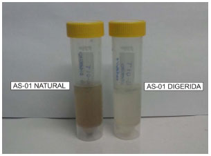 ![]() Figura 4. Amostra de água superficial (AS-01), antes e depois do tratamento por radiaçao UV