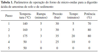 Instrumentação Para o desenvolvimento do método foi utilizado um espectrômetro de fluorescência atômica modelo PSA 10.055 Millenniun Excalibur (marca PS Analytical, London, UK). Faz-se importante mencionar que o espectrômetro não é disponível comercialmente para determinação de Sn. Este equipamento foi fornecido pela empresa PSA para o CEA/UNESP, contendo uma lâmpada de Sn de cátodo oco de alta intensidade (BDHCL) e um filtro específico para Sn. Os demais equipamentos utilizados foram: ICP OES (modelo iCAP 6000 Series ICP Emission Spectrometer, marca Thermo Fisher Scientific, Walthan, USA); Sistema de digestão por micro-ondas (modelo Speedwave®four, marca Berghof, Eningen, DE); Sistema de digestão em linha por radiação ultravioleta (modelo PSA 10.570 UV Cracker, marca PS Analytical, London, UK); Sistema purificador de água (Milli-Q, marca Millipore, Belford, USA) e sistema deionizador (RiOs 5, marca MilliPore, Belford, USA); Destilador de ácido sub-boiling (modelo BSB-939-IR, marca Berghof, Eningen, DE); Outros equipamentos de uso rotineiro em laboratórios de química analítica. Materiais e reagentes Todos os reagentes usados durante os experimentos foram de grau e pureza analítica. Todas as soluções foram preparadas com água ultrapura com resistividade de 18,2 MΩ cm-1. Os ácidos utilizados foram previamente destilados abaixo do ponto de ebulição. Os materiais de laboratório e vidrarias foram previamente descontaminados em imersão em HNO3 20% (v v-1) (Merck, Darmstadt, DE), por 4 horas em capela de exaustão. Foram então lavados 7 vezes com água deionizada e 3 vezes com água ultrapura. Após a lavagem, os materiais foram secos em capela de fluxo laminar, no interior de sala insuflada (sala limpa), por 36 horas. As soluções de borohidreto de sódio foram preparadas imediatamente antes das análises, a partir de NaBH4 98% (m m-1) (Sigma-Aldrich, St. Louis, USA), dissolvido em água ultrapura até atingir 2% (m v-1), contando com 0,1 mol L-1 de NaOH (Merck) como preservante. As soluções-padrão utilizadas para a otimização do método analítico foram preparadas a partir de Sn metálico (Sigma-Aldrich). Foram dissolvidos 100,0 mg de Sn metálico em 16 mL de solução de HCl 6 mol L-1 e H2O2 9% (v v-1) (Merck). O excesso de H2O2 foi retirado por aquecimento e ebulição, e então avolumado para 100 mL com água ultrapura. Através de diluições, foram preparadas soluções-padrão de trabalho contendo 0 a 100 µg L-1 Sn, preservadas em HCl 2% (v v-1) (Merck). A concentração da solução-padrão estoque de Sn(IV) foi checada através de uma curva analítica construída a partir de uma solução padrão estoque multielementar contendo 100 mg L-1 de Sn (Specsol®, Quimilab, Jacareí, BR), fornecidas com relatório de rastreabilidade ao National Institute of Standards and Technology (NIST, Gaithersburg, USA). As soluções-padrão de trabalho foram preparadas por diluição da solução-padrão estoque com água ultrapura e preservadas em HCl 2% (v v-1), em concentrações entre 0 e 100 µg L-1 Sn. Para avaliar a exatidão do método foi empegado o material de referência certificado MRC SRM 1944 - Waterway Sediment (NIST), e o material de referência MR GBW 07411 - Chinese Soil (Harbin, China). Preparo das amostras Solo e Sedimento As digestões de solo e sedimento, realizadas em micro-ondas, foram processadas conforme programação descrita abaixo (Tabela 1):
