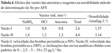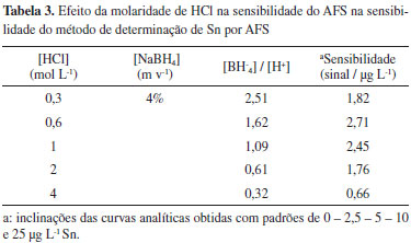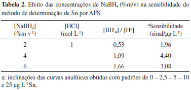 RESULTADOS E DISCUSSÃO Efeito da concentração do borohidreto de sódio Antes da avaliação do efeito da concentração de NaBH4, foi realizado um teste preliminar das concentrações de NaOH, o qual foi usado como preservante das soluções de NaBH4. Foram testadas as concentrações de 0,05 e 0,1 mol L-1 de NaOH. Quando o NaBH4 esteve preservado em 0,05 mol L-1 de NaOH, notou-se efeitos de drift (flutuação do sinal da fluorescência) devido à rápida decomposição do NaBH4. Foi então definida a concentração de 0,1 mol L-1 de NaOH, a qual garantiu a estabilidade necessária ao agente redutor durante o processo analítico. Para avaliar o efeito da concentração de NaBH4, foram testadas as concentrações de 1 - 2 - 4 - 6% deste reagente. Para o processo analítico foi definida a concentração de HCl 1 mol L-1 e mantidas as vazões das amostras e reagentes em 4 mL min-1. A concentração de 1% de NaBH4 não permitiu a formação da chama de atomização do equipamento. Os resultados indicaram uma maior sensibilidade para NaBH4 4%, como pode ser visualizado na Tabela 2. Nestas condições também se obteve a melhor relação linear (R² = 0,9965). Na condição otimizada obteve-se uma relação molar de [BH-4] / [H+] > 1, conforme sugerido por Dedina e Tsalev.17 Entretanto, pode-se observar que elevadas concentrações de NaBH4 prejudicam o processo de geração de SnH4, mesmo com o aumento da relação molar.