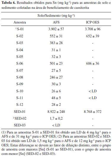 Não foi observada uma relação clara entre aumento do volume da solução extratora e a diminuição da eficiência da extração. Por exemplo, para solo não houve diferença significativa (nível de 95%) no processo de extração, quando o volume de ácidos foi reduzido de 9 para 4 ml. Para sedimento, as extrações mais eficientes foram obtidas com concentrações extremas de ácidos (4 e 9 ml). Aplicação do método - solo e sedimento Para avaliar a exatidão do método, as amostras S-01, S-02, S-06, S-10, S-11 e SED-01 foram analisadas pelo método proposto e posteriormente por ICP OES. Analisando a Tabela 6, nota-se que as concentrações de Sn obtidas nas amostras de solo, pelos dois métodos, são similares.