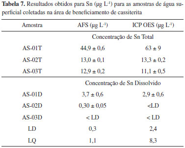 Quando comparados os LODs, nota-se que a AFS alcançou um limite de detecção 8 vezes inferior ao obtido na ICP-OES. Por sua vez, as concentrações obtidas usando os dois métodos mostram-se semelhantes para determinação dos teores totais e dissolvidos, evidenciando a exatidão do método proposto. Para os teores totais (AS-01T ao AS-03T), foi realizado um teste t pareado, mostrando que o conjunto de dados não é significativamente diferente (p=0,47), para um nível de confiança de 95%. Quando comparadas as frações totais e dissolvidas, os resultados demonstram que o Sn ocorre preferencialmente na forma particulada, ou seja, o metal está adsorvido à superfície de partículas sólidas suspensas, como o material coloidal e matéria orgânica. No tocante a questão ambiental, observa-se que nenhuma das amostras apresentou concentração de Sn acima do valor de referência ambiental adotado (RSL 1.200 µg L-1). Os pontos AS-02 e AS-03 estão localizados no córrego a jusante da empresa e, desta forma, é uma água em contínua renovação. Por sua vez, o ponto AS-01 trata-se da água do charco localizado no interior do empreendimento e apresentou concentração de Sn cerca de 4 vezes maior que os outros pontos. O charco é um ambiente lêntico, com abundante matéria orgânica, no qual ocorre naturalmente o acúmulo de sedimentos. O Sn contido no sedimento do charco pode ser remobilizado para a água, por diversos fatores químicos e físicos, como ressuspensão das formas precipitadas do metal complexado ou adsorvido.
