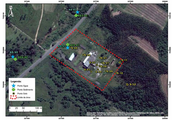 Figura 1. Localizaçao dos pontos de amostragem de solo, sedimento e água, na área da antiga indústria de beneficiamento de cassiterita