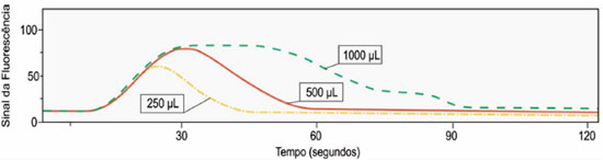 Efeito do volume de amostra injetado A Figura 3 ilustra os sinais transientes obtidos no sistema analítico otimizado, para volumes de 250, 500 e 1000 µL de uma solução padrão de 10 µg L-1 Sn. Pela análise da Figura 3, observa-se que a melhor condição analítica foi obtida para o volume de 500 µL. Este foi o menor volume de amostra em que a dispersão inerente do sistema de fluxo minimiza a diluição da amostra melhorando a sensibilidade analítica. Acima de 500 µL, as desvantagens relativas a efeito de memória e velocidade analítica são facilmente perceptíveis (vide Figura 3). O uso de tal volume permite ainda anular o efeito memória a partir de 60 segundos, tornando a análise rápida, com uma frequência analítica de 60 amostras h-1.