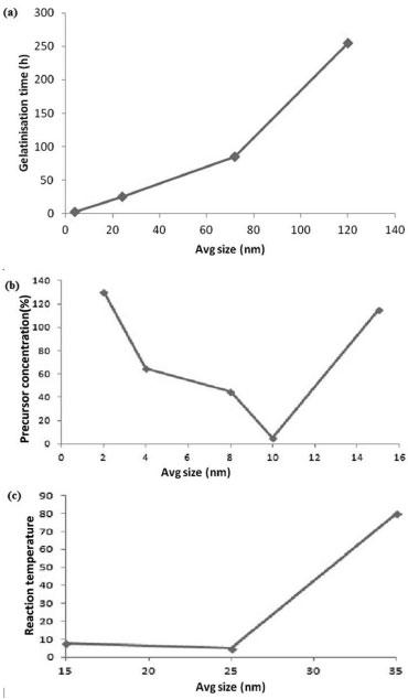 ![]() Figure 1. Average size of TiO2 nanoparticles synthesized with variation in gelatinization time (4, 24, 72 and 120 h), volume% concentration of precursor (TiCl4) in ethanol (2, 4, 8, 10 and 15%), and reaction temperature (15, 25 and 35 ºC)