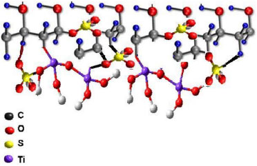 Evaluation of chemical structure Figure 3 depicts the schematic representation of nanocomposite membrane prepared in the present work. It clearly shows that the base membrane PVA contains chain of C. Figure 3 also depicts the chemical structure after sulfonation. Basically, after sulfonation, S is also appeared in chemical structure. In addition, Figure 3 also depicts the presence of Ti in chemical structure of nanocomposite membrane after the addition of TiO2 as nanofiller. The presence of S is also further confirmed with FTIR and the degree of sulfonation is evaluated. Figure 4 depicts spectra of pure PVA and SPVA membranes. Broad absorption bands are observed in both pure PVA and SPVA membranes. The spectrum range of pure PVA membrane is observed to be in the range of 3600 to 2700 cm-1, due to the O-H stretching mode in the hydroxyl groups (-OH). While, spectrum range of SPVA membrane is observed to be in the range of 3400 to 2900 cm-1 attributed to the asymmetric -CH2 stretching band in the PVA matrix.34 Few new peaks also appeared in spectra of SPVA membrane, as seen from Figure 4. The peaks at stretching vibrations of 1244, 1137 and 1024 cm-1 confirms sulfonation of PVA.33,35-37 The peak at 1244 and 1024 cm-1 are attributed to asymmetric stretching vibrations of S=O in the sulfonic acid group.34 The C=O stretching peak of carboxyl acid groups is viewed at 1736 cm-1 which confirms the cross-linking of membrane.35 The peak at 798 cm-1 is attributed to the presence of S-O group.33,35-37 Hence, it is confirmed that the prepared membrane is properly sulfonated as well as cross-linked.