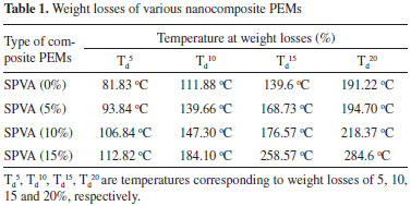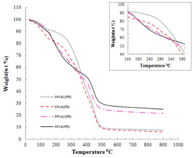 ![]() Figure 5. TGA of nanocomposite PEMs: SPVA (5%), SPVA (10%) and SPVA (15%)