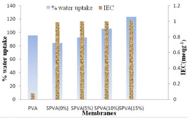 Ion exchange capacity and water uptake of membranes Figure 6 shows the ion exchange capacity (IEC) and water uptake of pure PVA membrane, pure SPVA membrane, and hybrid composite membranes. Due to the absence of any tendency to transform ions, pure PVA membrane depicted very small IEC (0.08 meq g-1), in spite of being cross-linked. On the other hand, sulfonated PVA depicted great increase in IEC (0.99 meq g-1), which is attributed to high and appropriate sulfonation of PVA. Addition of TiO2 nanofillers depicted further increase in IEC to 1.0 meq g-1 for SPVA (5%). Consequently, the concentration of TiO2 nanoparticles was increased, and corresponding ion exchange capacity was observed to be increased. Interestingly, excellent IEC (1.01 meq g-1) is observed for SPVA (15%) composite PEM, which is even higher than that reported for Nafion 117 based membrane (0.91 meq g-1).40 Nevertheless, it has been reported that TiO2 nanoparticles do not enhance IEC.41 However, as seen from Figure 2(b), addition of TiO2 nanoparticles do not affect the presence of ionic clusters formed by sulfonation of PVA, but hydration of membrane and ionic clusters formed due to sulfonation of PVA may lead to increased IEC. This is in line with the previously reported work on other nanofiller.15