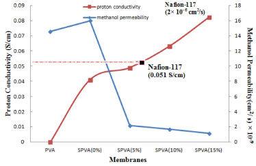![]() Figure 7. Proton conductivity and methanol permeability of nanocomposite PEMs