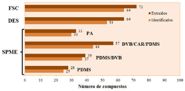 ![]() Figura 1. Número de compuestos extraídos e identificados en el café tostado en función del método de extracción