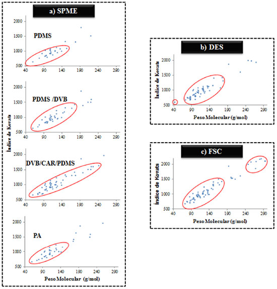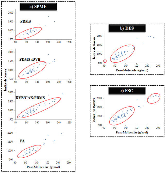 Figura 2. Capacidad de extracción de los diferentes métodos representados en función al Indice de Kovats y peso molecular