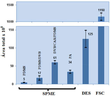 Pero comparando el método SPME fibra DVB/CAR/PDMS con las metodologías DES y FSC se evidencia una gran diferencia, siendo las área obtenidas por FSC aproximadamente diez veces mayor que con SPME; esto debido a la alta concentración de cafeína (789 x 108); y respecto a DES un poco más que el doble que SPME. Pero si se compara en función de los tipos de compuestos disminuye la diferencia (Figura 4), por ejemplo con los furanos que es el grupo funcional orgánico con mayor presencia se tiene áreas de 24 x 108 SPME fibra DVB/CAR/PDMS, 25 x 108 para FSC y 68 x 108 para DES. De manera global los métodos FSC y SPME fibra DVB/CAR/PDMS son los que nos permiten tener mayores área para todos los tipos de compuestos.