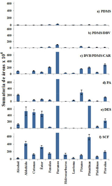 En el método SPME, las fibras PDMS y PA al tener un mecanismo no competitivo de absorción poseen características de extraer compuestos volátiles de menor peso molecular,36,40 concordando con los resultados que se muestran en la Figura 2. Medición y reproducibilidad de compuestos Los compuestos y sus áreas que tienen las cinco mayores respuestas para cada método de extracción (el área se encuentra entre paréntesis se expresa en unidades arbitrarias y debe multiplicarse por 106): para el método SPME fibra PDMS fueron cafeína (433), alcohol furfurílico (16), ácido acético (15), 2,6-bis(1,1-dimetiletil)-4-metil-fenol (10) y 3-hidroxi-2-metil-4H-piran-4-ona (6), con SPME fibra PDMS/DVB cafeína (1376), ácido acético (61), alcohol furfurílico (44), 3-hidroxi-2-metil-4h-piran-4-ona (42) y 2,6-bis(1,1-dimetil etil)-4-metil-fenol (17), para SPME fibra DVB/CAR/PDMS ácido acético (1235), cafeína (1063), alcohol furfurílico (878), 2-furanocarboxaldehído (716) y 5-metilfurfural (628); para SPME fibra PA fueron ácido acético (1036), alcohol furfurílico (754), cafeína (499), 3-hidroxi-2-metil-4h-piran-4-ona (199) y 2-(2-etoxietoxi)-etanol (135); para el método DES 2-furanocarboxaldehído (2570), 5-metilfurfural (1791), alcohol furfurílico (1293), 2-metilpirazina (916), 2,6-dimetilpirazina (856) y finalmente para el método FSC cafeína (78981), ácido palmítico (16881), ácido cis-linoleico (11467), ácido octadecanoico (2702) y alcohol furfurílico (1284), Flament41 indica que la presencia de ácidos grasos en estado libre se puede atribuir al tostado o la utilización de técnica de extracción. La oxidación del ácido linoleíco produce hexanal y compuestos volátiles secundarios que producen olores desagradables.42 El alcohol furfurílico es uno de los compuestos que presenta mayores áreas solo menor que el ácido acético y cafeína para las cuatro fibras en el método SPME. Korhonová et al.26 en su estudio sobre aroma del café encuentra que el alcohol furfurílico es el que presenta una mayor área, seguido por ácido acético en café arábico. Resalta que para el método SPME fibras PDMS y PDMS/DVB coinciden los seis primeros compuestos mayoritarios, pero con variaciones en el orden. Únicamente en la método DES la cafeína no se encuentra entre las primeras ocho áreas, debido a la característica de la metodología, que extrae en función a una destilación a 100 ºC, la cafeína al tener un punto de ebullición de 237 ºC se extrae principalmente por evaporación. La metodología FSC tiene mejor capacidad de extraer compuestos menos volátiles y con pesos moleculares altos. Este se ve demostrado con los cuatro compuestos que presentan las mayores áreas: cafeína, ácido palmítico, ácido cis-linoleico y ácido octadecanoico. El alcohol furfurílico, 5-metilfurfural y 2-furanocarboxaldehído coinciden como los compuestos con mayores áreas para DES y FSC. De los 123 compuestos encontrados 17 compuestos fueron detectados y 15 fueron identificados por los tres métodos de extracción: piridina, 2-metiltetrahidrofuran-3-ona, 2-metilpirazina, 2-furanocarboxaldehído, alcohol furfurílico, 1-hidroxi-2-propanona acetato, 1-(2-furanil)-etanona, 2,6-dimetilpirazina, etilpirazina, 2,3-dimetilpirazina, 5-metilfurfural, furfuril acetato, 2-etil-6-metilpirazina, 1-(1H-pirrol-2-yl)-etanona y cafeína. Los IK encontrados para estos compuestos están entre 749 a 1073 y los pesos moleculares (PM) entre 79,0999 a 140,1366 g/mol a excepción de la cafeína con IK de 1866 y PM 194,1906 g mol-1. Resalta que en este rango las mayores áreas se encuentran con DES, únicamente para la cafeína se obtiene una mayor área con FSC. Las áreas obtenidas para 2-metiltetrahidrofuran-3-ona, 2-metilpirazina, 1-hidroxi-2-propanona acetato, 2,6-dimetilpirazina, 2,3-dimetilpirazina y 2-etil-6-metilpirazina con el método de extracción DES son significativas diferentes comparadas con los otros dos métodos. Para el método SPME se detectaron 5 e identificaron 4 compuestos con todas las cuatro fibras: ácido acético, dihidro-2(3h)-furanona, 3-hidroxi-2-metil-4h-piran-4-ona y 2,6-bis(1,1-dimetiletil)-4-metil-fenol. Con la fibra DVB/CAR/PDMS se obtuvieron áreas mayores si se comparan con las otras fibras utilizadas en SPME, a excepción de los compuestos 1-hidroxi-2-propanona acetato, 2,6-dimetilpirazina, dihidro-2(3H)-furanona, 3-hidroxi-2-metil-4H-piran-4-ona y 2,6-bis(1,1-dimetiletil)-4-metil-fenol que presentaron mayor área con la fibra PA. La piridina a pesar de tener un IK de 749 y PM de 79,0999 g/mol presenta un área con FSC que no tienen diferencia significativa con el método DES y SPME fibra DVB/CAR/PDMS, de los cuales se esperaría tener un área mayor por la afinidad a este compuesto, por su punto de ebullición bajo de 115,2 ºC. La reproducibilidad de tres repeticiones para el método SPME con las cuatro fibras, es igual o inferior al 11%, resultado similar al indicado por Mestres43 al realizar inyección manual con fibras PDMS y PA para el análisis de volátiles en vino y al reportado por Hayasaka44 de 10% al analizar diacetil en vino, con fibra PDMS y Carbowax/DBV (CW/DVB), menor al valor obtenido por Miller45 de 11,3% al analizar jugo de frutas con las fibras PDMS, PA, Carboxen, PDMS, PDMS/DVB y CW/DVB y mayores a los reportados por Costa et al.40 de 6,8%, al utilizar fibra de PDMS y CW/DBV. Eficiencia de los métodos de extracción Los resultados en función a la sumatorias de área de pico para los compuestos identificados se muestran en la Figura 3. En SPME al comparar los resultados encontrados con las cuatro fibras, se evidencia un mayor potencial para la fibra DBV/CAR/ PDMS obteniendo una sumatoria de áreas aproximadamente igual al doble que para la fibra PA, cuatro y doce veces mayor comprada con las fibras PDMS/DVB y PDMS respectivamente. Esto es debido a que su composición le confiere la posibilidad de extraer compuestos con diferente estructura y polaridad.46