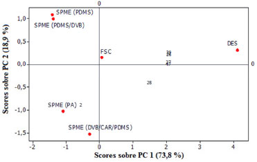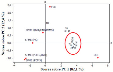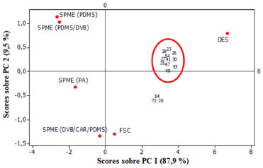 ACP con 14 compuestos identificados (sin cafeína) en todas las metodologías Al excluir la cafeína del ACP, el resultado para el método FSC cambia notoriamente como era de esperar (Figura 6), al ser un método con mayor afinidad por compuestos con pesos moleculares mayores, ahora presenta un comportamiento muy similar a SPME fibra DVB/CAR/PDMS con afinidad a los compuestos piridina, alcohol furfurílico y 1-(1H-pirrol-2-yl)-etanona (14, 28 y 72). El comportamiento de SPME fibras PDMS y PDMS/DVB se repite comparado con la evaluación anterior, este debido principalmente a sus pobres capacidades de extraer compuestos. En éste análisis los dos primero componentes aportan el 97,4% de la información aproximadamente 3% más que al incluir cafeína en el análisis, también aumenta la información del primer componente obteniendo el 87,9%, teniendo correlación positiva con todos los 14 compuestos. El segundo componente aporta el 9,5% de la información resaltando su correlación negativa con los compuestos 14, 28 y 72 brindando la información relacionada con los métodos FSC y SPME fibra DVB/CAR/PDMS. El método DES mantiene su afinidad por los mismos 11 compuestos resaltados en la Figura 5.
