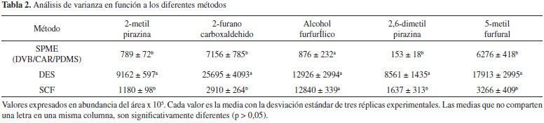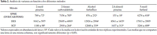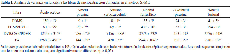 Análisis de varianza Korhonová et al.26 en su estudio sobre el aroma del café concluyen que los siguientes compuestos: ácido acético, 2-metilpirazina, 2-furano carboxaldehído, alcohol furfurílico, 2,6-dimetilpirazina y 5-metilfurfural (2, 26, 27, 28, 39 y 47), proveen suficiente información para diferenciar 30 muestras de café, por lo cual se escogió estos compuestos como marcadores para determinar que método permite la mejor extracción. En la Tabla 1 se presentan los resultados encontrados al realizar un análisis de varianza simple para cada compuesto versus las fibras utilizadas en el método SPME (resultados expresados como áreas de los picos). De éste análisis resulta que la fibra PDMS/DVB/CAR nos permite extraer una mayor cantidad para los compuestos analizados, no existiendo diferencia significativa (p > 0,05) con la fibra PA para los compuestos ácido acético, alcohol furfurílico y 2,6-dimetilpirazina, los cuales son compuestos polares; para el 2-furano carboxaldehído y 5-metilfurfural que no son polares se evidencia una gran diferencia entre las fibras PDMS/DVB/CAR y PA, debido a la propiedad que tiene la fibra de tres fases de extraer compuestos polares y apolares.