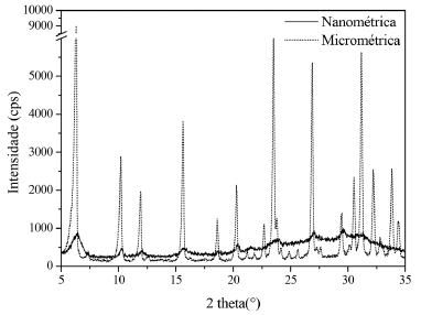 ![]() Figura 1. Difratograma da zeólita nanométrica e micrométrica, N-NaX e NaX