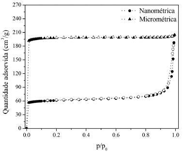 ![]() Figura 3. Isoterma de fisissorção de nitrogênio sobre a zeólita N-NaX e NaX, nanométrica e micrométrica