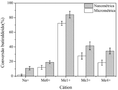 ![]() Figura 7. Conversão do butiraldeído apresentada pelas zeólitas nanométrica e micrométrica contendo cátions metilamônio