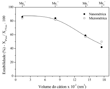 ![]() Figura 8. Estabilidade catalítica apresentada pelos catalisadores nanométrico e micrométrico em função do volume dos cátions de metilamônio