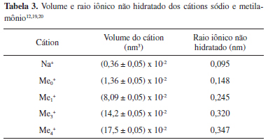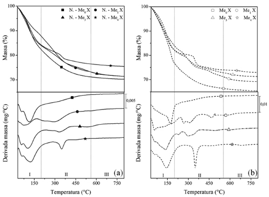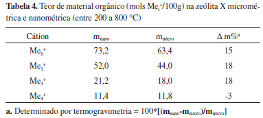Região I: entre 25 e 200 ºC, correspondente à dessorção da água fisissorvida. Em geral, as temperaturas onde ocorre a máxima taxa de dessorção são inferiores na zeólita nanométrica, sugerindo que este processo é facilitado pela diminuição do tamanho das partículas. Região II: entre 200 e 550 ºC, corresponde à decomposição dos cátions amônio, Mei+. Nesta região, os picos formados pelas derivadas de decomposição ficam melhor definidos com o aumento do volume do cátion amônio. Região III: acima de 550 ºC, a perda de massa ocorre devido à desidroxilação da hidroxila formada pelo próton resultante da decomposição dos cátions de metilamônio.19-21 A Tabela 4 apresenta o teor dos cátions orgânicos nas zeólitas, em mol por 100 g de zeólita, estimado pela perda de massa entre as temperaturas de 200 a 800 ºC (Região II + III da Figura 6). Observa-se que, para a maioria dos cátions utilizados, a zeólita nanométrica apresentou um maior teor de cátions orgânicos em comparação à zeólita micrométrica. Esses resultados estão de acordo com os obtidos em relação ao grau de troca do cátion sódio (Figuras 4 e 5) e são decorrentes da maior acessibilidade existente na zeólita nanométrica. No caso do cátion tetrametilamônio, Me4+, devido ao seu maior diâmetro cinético, o efeito da acessibilidade é menos acentuado e o teor desse cátion em ambas zeólitas é muito similar.