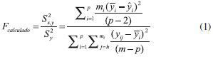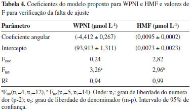 Nenhum dos pressupostos testados foi violado no intervalo de 95% de confiança, pois os p-valores encontrados para os testes realizados foram maiores do que 0,05. Em outras palavras, os modelos apresentaram comportamento normal. Os resultados para o teste de Cochran apresentaram valores abaixo dos tabelados (Ctab de 0,72 e de 0,66 para os modelos de WPNI e HMF, respectivamente) confirmando o comportamento homocedástico dos modelos. A independência foi atendida através da realização de experimentos de maneira aleatória (mediante sorteio) e com réplicas autênticas.36 Para a verificação da falta de ajuste do modelo utilizou-se Teste de Hipótese a priori (equação 1) recomendado pela IUPAC,37 conforme descrito na equação (1). ![]() sendo: mi = número de medidas de cada ponto; p = número de pontos ou níveis; m = mi x p. Se o valor calculado de Fcalc (p-2, m-p) for menor que o valor de Ftab dentro do intervalo estimado, não haverá falta de ajuste no modelo e os coeficientes angular e linear das equações obtidas na etapa descritiva poderão ser usados para a predição quantitativa. Os valores dos parâmetros dos modelos para WPNI e HMF, bem como os valores de F para falta de ajuste, estão representados na Tabela 4. Os modelos de regressão foram considerados satisfatórios, uma vez que os valores de Fcalc foram menores que Ftab e, portanto, pode-se afirmar que, para o intervalo de 95% de confiança estimado, não há evidência de falta de ajuste nos modelos propostos.