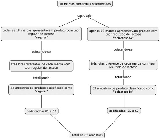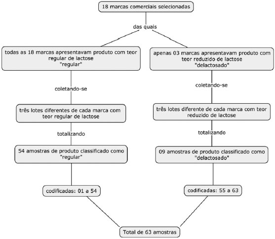 Figura 1. Esquema da amostragem realizada no mercado brasileiro, evidenciando o número de amostras coletado para cada tipo de leite ("regular" e "delactosado")