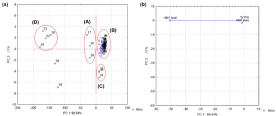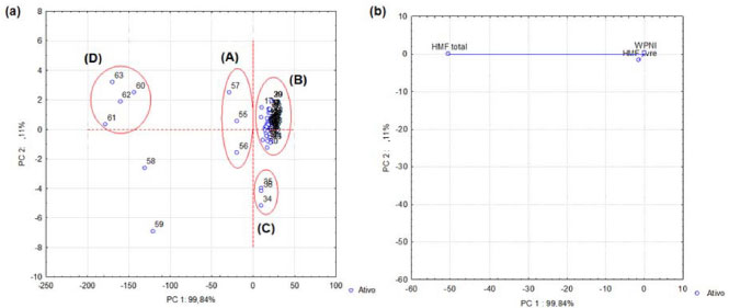 Figura 3. Gráfico de (a) escores e (b) loadings de PC 1 versus PC 2 para os índices WPNI, HMF livre e HMF total avaliados em 63 amostras comerciais de leite UHT evidenciando a formação de grupos distintos