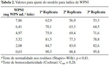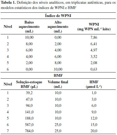 Para a construção da curva analítica para o índice de WPNI utilizou-se padrões de leite em pó desnatado ADPI25 submetidos a elevado aquecimento (baixa concentração de WPNI: 0,63 mg WPN mL-1 leite) e a baixo aquecimento (alta concentração de WPNI: 7,86 mg WPN mL-1 leite). O mesmo procedimento analítico proposto para as amostras foi aplicado aos padrões de leite ADPI, sendo os filtrados de cada um coletados e utilizados para a construção dos níveis da curva de acordo com os índices de WPNI descritos na Tabela 1.