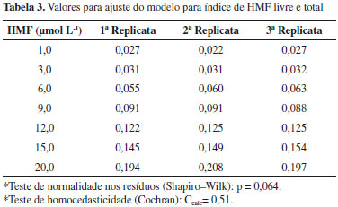 RESULTADOS E DISCUSÃO Ajuste dos modelos para quantificação do índice de WPNI e HMF Usualmente, os trabalhos descritos na literatura abordando a determinação de WPNI e HMF não descrevem de forma clara o uso da análise estatística ou, ainda, como foi aplicada a estatística para o ajuste de regressão por mínimos quadrados ordinários de um modelo linear nos parâmetros.22 Do ponto de vista formal, pressupostos como independência, homocedasticidade e normalidade devem ser verificados, a fim de garantir a confiabilidade das informações a serem inferidas. Dentro deste contexto, no intuito de verificar se o modelo proposto apresenta comportamento linear adequado, todos os experimentos na etapa descritiva foram realizados aleatoriamente a partir de uma solução padrão estoque de concentração definida (independência), e as respostas de sinais obtidas a partir das leituras submetidas ao teste de Cochran (teste de homocedasticidade), verificação da falta de ajuste do modelo através do teste ANOVA a priori e, por fim, avaliação da normalidade nos resíduos (teste de Shapiro-Wilk). Os valores para ajuste de modelo para WPNI e HMF se encontram nas Tabelas 2 e 3, respectivamente.