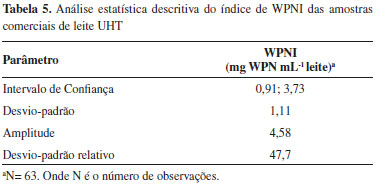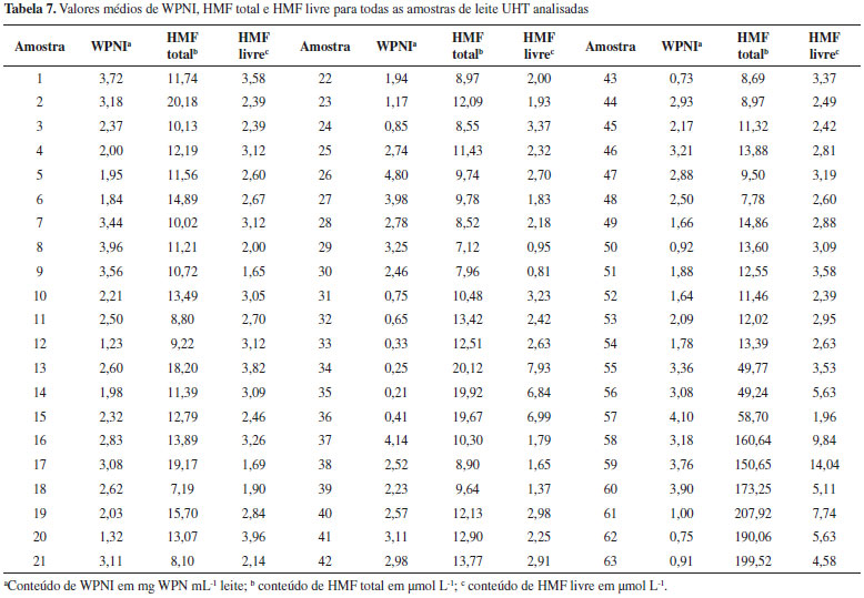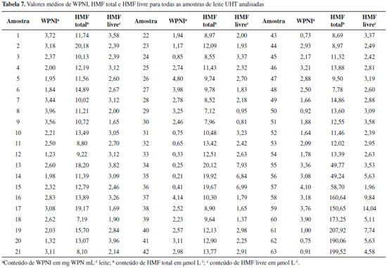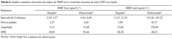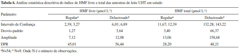 O mapeamento do mercado brasileiro atual de leite UHT através deste trabalho demonstra o enquadramento de 75% das amostras avaliadas na classificação de "produto de médio aquecimento" e de 24% na classificação de "produto de alto aquecimento", de acordo com o American Dairy Products Institute (ADPI).25 O valor médio encontrado de 2,32 mg WPN mL-1 leite evidencia a classificação da maioria das amostras analisadas como "produto submetido a médio aquecimento", ainda que o amplo intervalo de confiança demonstre a existência de amostras de "baixo aquecimento" e "alto aquecimento". Esta classificação, criada pelo ADPI, sugere uma ideia da severidade do tratamento térmico ao qual o produto foi submetido e, consequentemente, da intensidade dos danos associados a este tratamento para o produto final. Devido aos inúmeros problemas associados à excessiva exposição do leite ao calor, a indústria deve buscar possíveis alterações de processamento capazes de diminuir a severidade do tratamento térmico oferecido a fim de reduzir perdas nutricionais, manter as características sensoriais do produto e sua estabilidade durante todo período de comercialização. Com base no exposto, os órgãos regulamentadores podem passar a considerar o índice de WPNI como um parâmetro legal a ser monitorado. A elevada amplitude dos resultados e amplo intervalo de confiança demonstram haver uma heterogeneidade de processamento térmico adotado pelas indústrias responsáveis por cada marca selecionada no presente estudo. Tal despadronização pode ser atribuída a fatores como: i) diferentes tipos de equipamento utilizados, ii) adoção de diferentes combinações para binômios tempo/temperatura, ainda que dentro da faixa estabelecida pela legislação vigente e iii) ocorrência de problemas durante o processamento, implicando em recirculação do produto na linha de produção e, consequentemente, intensificando os efeitos causados pelo calor devido à exposição prolongada do produto ao mesmo. De acordo com Silva31 a sedimentação é caracterizada como o efeito da perda progressiva de estabilidade proteica no leite submetido ao calor. Este mesmo autor verificou experimentalmente o efeito acumulativo das diversas etapas de aquecimento ao longo do processamento, além de variações nos parâmetros como fluxo do produto no equipamento ou eventual recirculação, as quais tendem a interferir no nível de desnaturação proteica. Portanto, o índice de WPNI torna-se uma ferramenta que pode ser facilmente adotada pela indústria como um atributo de controle e avaliação, capaz de estimar a severidade do tratamento térmico utilizado, oferecendo informações relevantes quanto à estabilidade do produto a ser comercializado. Informações a respeito do intervalo de confiança e da estatística descritiva para os índices de HMF total e livre são apresentados na Tabela 6. As amostras identificadas como "delactosado" e "regular" foram analisadas separadamente devido ao comportamento distinto evidenciado para ambos os índices determinados.