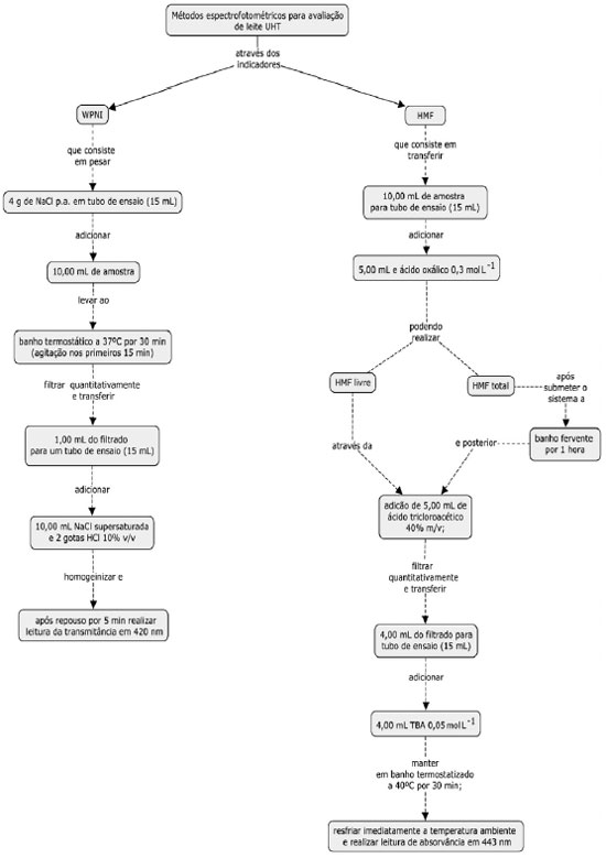 Figura 2. Fluxograma das metodologias propostas para determinação dos índices de WPNI e HMF em leite