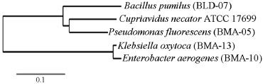 ![]() Figura 1. Dendograma obtido em decorrência do alinhamento múltiplo das sequências 16S rDNA dos isolados BMA-05, 10, 13 e BLD-07, os quais tiveram 99 % de identidade com as bactérias Pseudomonas fluorescens P10-1, Enterobacter aerogenes KCTC 2190, Klebsiella oxytoca KCTC 1686 e Bacillus pumilus SAFR-032, respectivamente