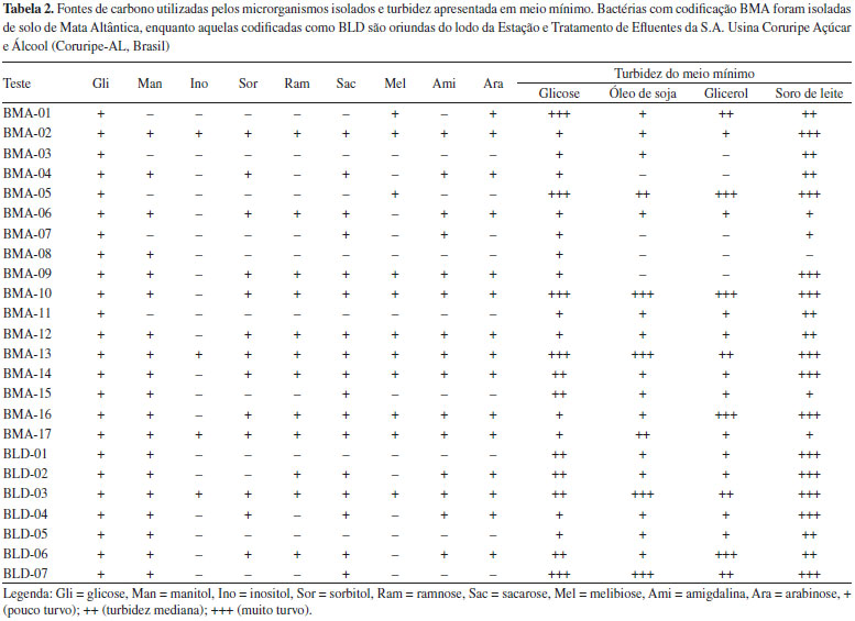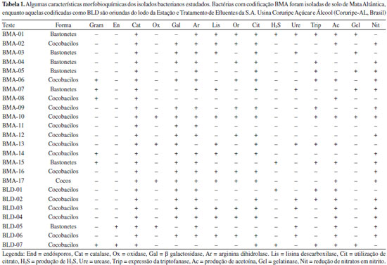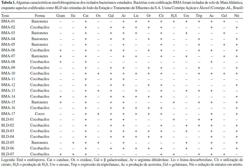 RESULTADOS E DISCUSSAO Perfil bioquímico dos microrganismos isolados Foram isoladas 24 bactérias, sendo 17 nas amostras de solo (horizonte A) da Mata Atlântica e sete nas de lodo de ETE de agroindústria de Coruripe-AL. O pequeno número de isolados pode ser explicado pela composiçao do meio de cultura que foi utilizado para o isolamento, isto é, limitado em nitrogênio [0,2 g L-1 de (NH4)2SO4]. As linhagens produtoras de PHAs sao classificadas em dois grupos principais, baseado nas condiçoes de cultivo que estimulam a produçao do polímero: há aquelas que necessitam da limitaçao de um elemento essencial como N, P, Mg, K, O ou S, e aquelas que produzem o polímero mesmo quando há abundância de todos os nutrientes. Porém, mesmo nesse último caso, as bactérias sintetizam maior quantidade de PHA quando o meio é limitante e, por isso, o meio mínimo limitado em nitrogênio é escolhido pelos pesquisadores quando buscam selecionar microrganismos autóctones produtores do polímero.15 A quase totalidade das bactérias utiliza compostos inorgânicos de nitrogênio, em especial sais de amônio e ocasionalmente nitratos (raramente nitritos), mas alguns isolados exigem fontes orgânicas, representadas por um número variável de aminoácidos. Assim, a ausência de fontes orgânicas impediu o crescimento de colônias representativas dos microbiomas presentes nas amostras, restringindo-se ao aparecimento somente daquelas de interesse, isto é, potencialmente produtoras de PHAs. Apesar de gêneros formadores de endósporos serem comumente encontrados no solo (como Bacillus, Clostridium, Sporosarcina e Streptomyces), nenhum dos 17 microrganismos isolados do solo de Mata Atlântica apresentou tal estrutura no interior celular após serem corados com verde malaquita. Por outro lado, das sete bactérias isoladas do lodo da ETE, duas (BLD05 e BLD07) sao Gram positivas formadora de endósporos. A catalase, enzima importante para as bactérias no combate ao excesso de radicais livres na célula, foi detectada em todos os microrganismos isolados. As características morfológicas e bioquímicas dos isolados obtidos neste trabalho estao expostas na Tabela 1.