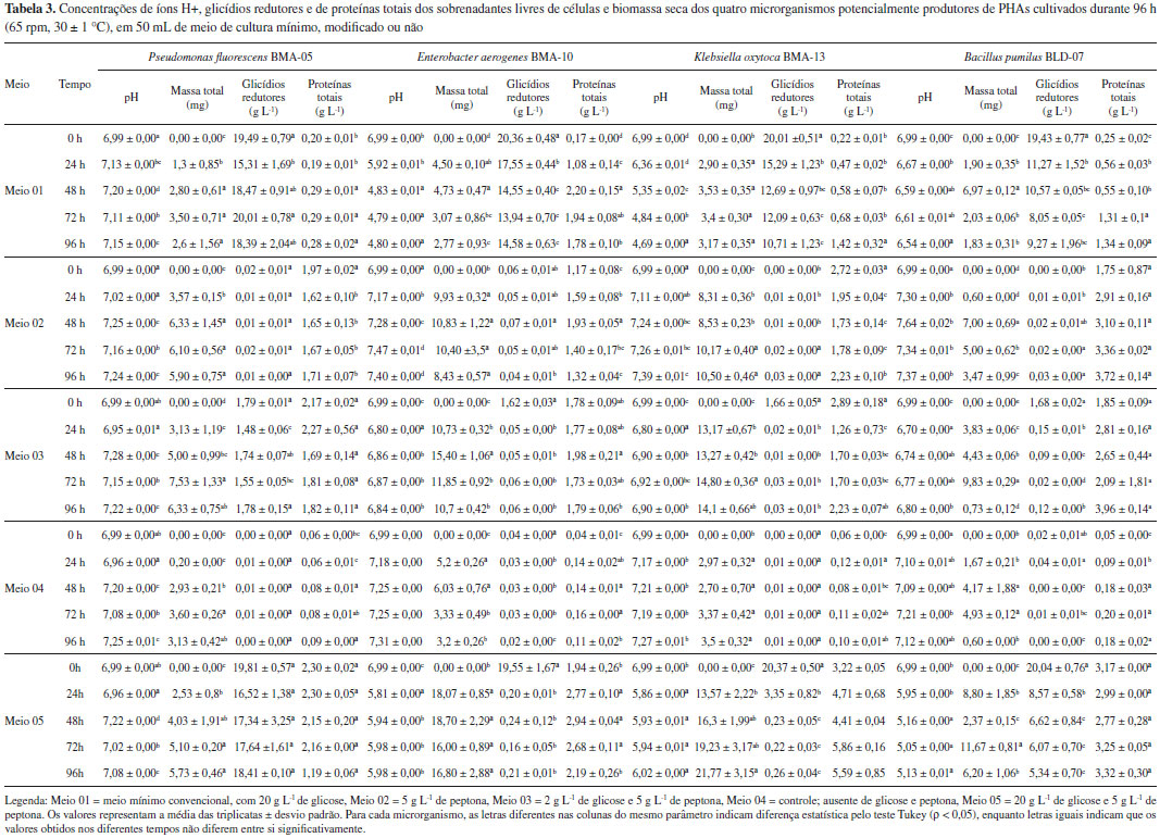 Esse resultado está de acordo com Sreekanth et al.,36 que estudaram como diferentes fontes de nitrogênio (0,2 g N L-1) afetam o rendimento da produçao de PHA e α-amilase numa cepa de Bacillus sp. cultivada em meio contendo 20 g L-1 de sacarose como fonte de carbono. Os autores observaram que fontes orgânicas de nitrogênio resultaram em maior biomassa e também maior quantidade de PHA dentro das células. Rendimentos de PHA diferenciados como reflexo da fonte nitrogenada presente no meio de cultura também foram documentados em outros experimentos semelhantes.36-39 Yüksekdağ et al.,38 por exemplo, demonstraram que em meio contendo peptona, duas linhagens de Bacillus apresentaram os maiores rendimentos de PHB em comparaçao com os meios contendo sulfato de amônio, nitrato de potássio, e os aminoácidos L-cisteína e L-glicina (sempre na concentraçao de 20 g L-1). Já Gomaa et al.39 avaliaram o efeito de 19 fontes de nitrogênio na produçao de PHA em Bacillus subtilis e verificaram que sulfato de amônio e nitrato de amônio na concentraçao de 1 g L-1 foram as melhores fontes para o crescimento da cepa. No presente trabalho, é possível afirmar que a adiçao de hidrolisado de proteínas favoreceu o crescimento de Enterobacter aerogenes BMA-10 Klebsiella oxytoca BMA-13. Todavia, os crescimentos observados no meio 01 foram equiparáveis aos do meio 04. Nesta última condiçao, as células bacterianas conseguiram se multiplicar em meio ausente de glicose provavelmente devido à presença de alguma fonte de carbono que ainda tenha restado no meio de cultura que foi introduzido juntamente com o inóculo, pois quando qualquer microrganismo se multiplica no meio de cultura, há um decréscimo proporcional na quantidade de nutrientes até o ponto em que a concentraçao de nutrientes por organismo atinja um nível crítico e a multiplicaçao cesse. Pseudomonas fluorescens BMA-05 foi o único isolado que nao acidificou nenhum dos meios de cultura, em nenhum dos tempos. Para os outros três isolados, os meios 02, 03 e 04 mantiveram-se próximos da neutralidade em todos os intervalos de tempo amostrados. Os meios 01 e 05, por sua vez, sofreram acidificaçao já após 24 h de cultivo, permanecendo na mesma faixa de pH até o final do experimento. Entretanto, como o meio 01 é limitado em nitrogênio [0,2 g L-1 de (NH4)2SO4], os microrganismos consumiram somente até 50% da glicose após 96 h de cultivo. Esse meio de cultura é comumente utilizado por pesquisadores que buscam selecionar possíveis bactérias produtoras de PHAs, entretanto, tais condiçoes nutricionais nao sao válidas para todos os microrganismos. Shi et al.,40 por exemplo, verificaram que para Brachymonas sp. P12 as condiçoes de excesso de carbono tiveram efeito negativo no acúmulo de PHA quando comparado a condiçoes limitantes de carbono. Nessa cultura, a aeraçao, limitaçao de C, excesso ou limitaçao de N e excesso ou limitaçao de P afetam a produçao de PHA. No meio 05, grande parte da glicose foi rapidamente consumida tanto por Enterobacter aerogenes BMA-10 como Klebsiella oxytoca BMA-13 e resultaram em maior biomassa desses microrganismos. Por sua vez, tanto Bacillus pumilus BLD-07 como Pseudomonas fluorescens BMA-05 apresentaram comportamento semelhante nesses dois meios de cultura. Encontrar a condiçao ideal para a produçao do biopolímero varia nao somente de acordo com a espécie bacteriana, mas também entre as diferentes cepas da mesma espécie,41 e como o nitrogênio faz parte da composiçao de macromoléculas como proteínas e ácidos nucleicos, a adiçao dele faz-se necessária à multiplicaçao microbiana.