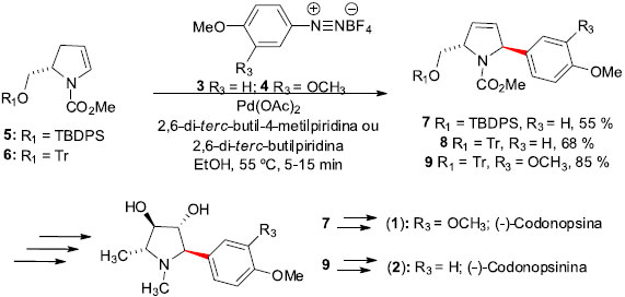 Sínteses totais de produtos naturais empregando a reaçao de Heck As primeiras moléculas de origem natural que temos notícia de síntese em território brasileiro, empregando a reaçao de Heck, sao os alcaloides pirrolidínicos (-)-Codonopsina (1) e (-)-Codonopsinina (2). Essas moléculas foram isoladas das partes aéreas de Codonopsis clematidea. Estes dois alcaloides exibem atividade antibiótica e hipotensiva em estudos com animais, sem apresentar qualquer efeito sobre o sistema nervoso central.17 Correia e colaboradores, em trabalho desenvolvido no Instituto de Química da UNICAMP/SP,18 iniciaram a síntese desses alcaloides aplicando as condiçoes de arilaçao de Heck-Matsuda, empregando os sais de diazônio 3 e 4, com os enecarbamatos enantiomericamente puros 5 e 6, na presença de 2,6-di-terc-butilpiridina ou 2,6-di-terc-butil-4-metilpiridina como base. Esta condiçao levou aos desejados produtos Heck 7-9 em rendimentos razoáveis (36-85%), mas com altas régio e estereosseletividades (Esquema 2). O uso de etanol (EtOH) como solvente e a presença da base provaram ser cruciais para o sucesso da reaçao. Posteriores modificaçoes sintéticas nos compostos 7 e 9 levaram à síntese total dos alcaloides (-)-Codonopsina (1) e (-)-Codonopsinina (2).