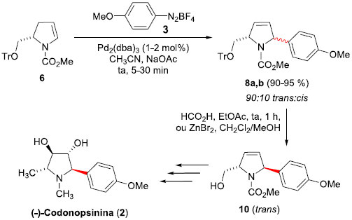 Em 2000, Correia e colaboradores19 propuseram um aprimoramento da rota sintética para a síntese da (-)-Codonopsinina (2), com melhorias significativas sobre a arilaçao de Heck. Na tentativa de otimizar ainda mais os rendimentos do acoplamento entre o enecarbamato tritilado 6 e o sal de diazônio 3, os autores descobriram que a arilaçao de Heck pode ser realizada em rendimentos elevados e com boa estereosseletividade (90:10 anti:syn). Para tal, empregaram apenas 1% de Pd2(dba)3 e acetonitrila como solvente, à temperatura ambiente e na presença de acetato de sódio como base, levando aos produtos Heck 8a,b em rendimentos elevados (90-95%). A separaçao dos diastereoisômeros trans:cis foi realizada facilmente após a remoçao do grupo tritila (HCO2H, EtOAc, temperatura ambiente, 1 h, ou ZnBr2, CH2Cl2/MeOH), permitindo a obtençao de 10 trans (Esquema 3). Uma sequência de transformaçoes permitiu a síntese total da (-)-Codonopsinina (2) em 7 etapas e 16% de rendimento total, superior à anteriormente descrita.