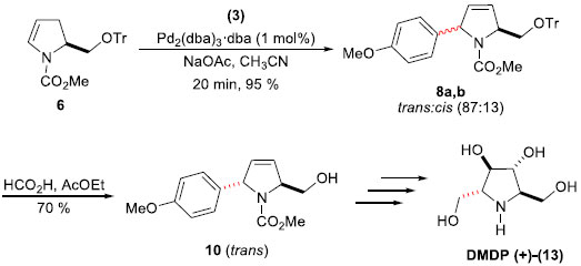 O (2R,3R,4R,5R)-2,5-di-hidróxi-metil-3,4-di-hidróxi-pirrolidina (DMDP) (+)-(13) é um potente inibidor natural de α- e β-glicosidases,23 e teve sua síntese também alcançada empregando-se a mesma estratégia descrita anteriormente. A etapa chave de arilaçao de Heck-Matsuda foi realizada entre o enecarbamato quiral 6 com o sal tetra-flúor-borato de p-metóxi-benzenodiazônio (3), fornecendo uma mistura das arilpirrolidinas 8a,b em 95% de rendimento como uma mistura diastereoisomérica trans:cis na proporçao de 87:13 (Esquema 5). Remoçao do grupo tritila permitiu a separaçao dos diastereoisômeros e a obtençao de 10 trans em 70% de rendimento. Após estas eficientes etapas de reaçao de acoplamento e purificaçao diastereoisomérica, a síntese foi alcançada com mais oito etapas, levando ao DMDP (+)-(13) em rendimento total de 12%.