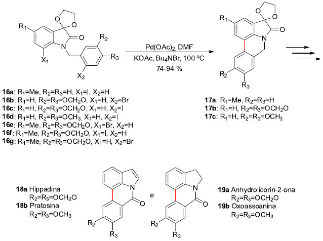 Os alcaloides isolados de plantas da família Amaryllidaceae fazem parte de um subgrupo, onde a licorina é a substância mais conhecida. Os compostos deste subgrupo possuem propriedades biológicas significantes e apresentam como característica estrutural os núcleos pirrolo[3,2,1-de]fenantridinas ou di-hidro-pirrolo[3,2,1-de]fenantridinas.24 Por estas razoes, em 2004 o grupo de Garden e colaboradores, sediado na UFRJ/RJ, desenvolveu a síntese de uma série de alcaloides deste grupo de compostos,25 empregando reaçoes de acoplamento do tipo aril-aril catalisadas por paládio, através das condiçoes de Heck desenvolvidas por Jeffery.26 Para tal, uma série de N-benzil-isatinas 16a-g foram preparadas e submetidas à ciclizaçao na presença de 10 mol% de Pd(OAc)2 em DMF (0,1 mol L-1), contando com KOAc como base e Bu4NBr com aditivo à 100 ºC, sem preocupaçoes com meio anidro ou uso de atmosfera inerte (Esquema 6). Os produtos de acoplamento 17a,b,c foram obtidos em rendimentos na faixa de 74-94%. Posteriores manipulaçoes levaram à síntese total dos alcaloides Hippadina (18a), Pratosina (18b), Anhydrolicorin-2-ona (19a) e Oxoassoanina (19b), em um total de 7 etapas e em rendimentos médios de 12% para os dois primeiros e de 50% para os dois últimos. Ainda foram obtidos outros alcaloides da mesma família, mas que, devido às suas instabilidades, nao foram completamente isolados e caracterizados.