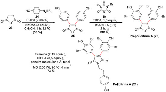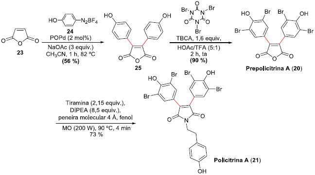 Anidridos maleicos e maleimidas ariladas estao presentes nas estruturas da Prepolicitrina A (20)27 e das Policitrinas A (21) e B (22),28 produtos naturais obtidos de ascídios marinhos do gênero Polycitor. Em 2006, Correia e colaboradores29 propuseram as sínteses totais das Prepolicitrina A (20) e da Policitrina A (21), empregando reaçoes de arilaçao de Heck-Matsuda sobre o anidrido maleico, demonstrando a versatilidade da metodologia desenvolvida no grupo de pesquisa. Contudo, posteriormente o mesmo grupo aprimorou a metodologia de preparaçao dos produtos naturais, o que permitiu sínteses mais eficientes, bem como também a síntese da Policitrina B (22), um derivado nao simétrico do anidrido maleico.30 Nestes novos eficientes protocolos, arilaçoes de Heck-Matsuda31 foram empregadas e permitiram sínteses em rendimentos mais elevados. A síntese da Prepolicitrina A (20) foi alcançada através da reaçao de arilaçao Heck-Matsuda entre o anidrido maleico (23) e o tetra-flúor-borato de 4-hidróxi-fenildiazônio (24), mediada por catalisadores do tipo complexos ácido fosfino-paládio (POPd),32 na presença de acetato de sódio em acetonitrila. A preparaçao do diaril derivado 25 em 56% de rendimento, apesar do rendimento moderado, permitiu a síntese de 20 com apenas mais uma etapa de bromaçao, empregando ácido tri-bromo-isocianúrico (TBCA) em alto rendimento. Para obter 21, a Prepolicitrina A (20) foi submetida à reaçao com tiramina, base de Hunig e fenol, sob irradiaçao com micro-ondas (90 °C, 200 W, 4 min), com rendimento superior à reaçao térmica normal. Esta rota otimizada permitiu a síntese total da Prepolicitrina A (20) em apenas 2 etapas e 50% de rendimento, e da Policitrina A (21) em 3 etapas e 37% de rendimento global, ambas a partir do anidrido maleico (Esquema 7). Os rendimentos das primeiras sínteses (2006) eram de 29% em 3 etapas e de apenas 12% em 4 etapas, respectivamente, demonstrando a evoluçao da metodologia.