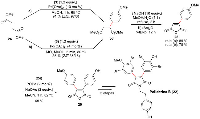 Para a síntese da Policitrina B (22), uma estratégia mais arrojada foi empregada. A síntese iniciou com a reaçao do fumarato de dimetila (26) com tetra-flúor-borato de 4-metóxi-fenil-diazônio (3) através das rotas a ou b (Esquema 8). Na rota a, o acoplamento foi realizado empregando Pd(OAc)2 (10 mol%) como catalisador, em metanol e refluxo, durante 1 h. Esta condiçao forneceu a síntese estereosseletiva do aduto de Heck mono-aril maleato de dimetila (27) em um rendimento purificado de 91%. Já a rota b permitiu reduçao na quantidade do catalisador de paládio (4 mol%) e a reaçao foi feita sob irradiaçao de micro-ondas. Esta reaçao ficou completa em apenas 5 minutos, formando o aduto Heck 27 em 85% de rendimento, com uma proporçao (Z/E) de 85:15. A transformaçao de 27 ao anidrido mono-aril maleico 28 aconteceu em duas etapas e 89% de rendimento, fornecendo o novo intermediário para a segunda arilaçao. A nova reaçao de Heck-Matsuda entre 28 e tetra-flúor-borato de 4-hidróxi-benzenodiazônio (24), 2% molar de catalisador POPd, e NaOAc como a base em acetonitrila à 80 °C formou o anidrido 3,4-diaril-maleico nao simétrico 29, em um rendimento isolado de 69%. Transformaçao de 29 na Policitrina B (22) foi efetuada após mais duas etapas, o que permitiu a segunda síntese total do produto natural em 5 etapas e 47% de rendimento global.