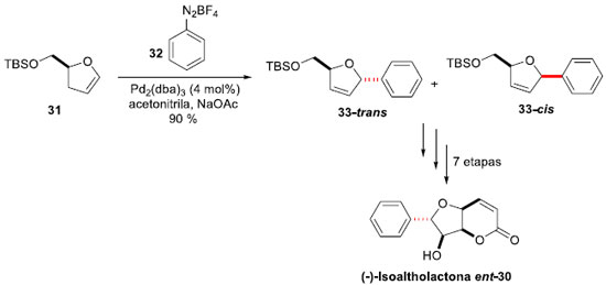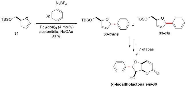 (+)-Isoaltholactona (30) é uma furanopiranose da família das estiril-lactonas, isolada de várias espécies de árvores malasianas do gênero Goniothalamus (G. malayanus, G. Montanus e G. tapis),33 que apresenta importantes atividades biológicas, tais como antitumoral, antifúngica e antibacteriana.34 A fim de expandir as possibilidades sintéticas da estratégia de acoplamento de Heck-Matsuda, Correia e colaboradores propuseram a síntese de ent-30,35 devido ao alto custo do material de partida necessário para o produto natural. Assim, a reaçao de arilaçao foi realizada entre a di-hidrofuranona 31, obtida a partir do ácido glutâmico natural, e o tetra-flúor-borato de benzenodiazônio (32), gerando o produto de arilaçao 33. Após extensa experimentaçao, as melhores condiçoes foram aquelas em que 4 mol% de Pd2(dba)3 em acetonitrila, com NaOAc como base, forneceram 33 em 90% de rendimento como uma mistura 94:06 trans:cis (Esquema 9). A mistura pode ser separada por técnicas cromatográficas após dessililaçao, e manipulaçoes sintéticas levaram à síntese da (-)-Isoaltholactona ent-30 em 7 etapas, a partir de 31, em 25% de rendimento global.