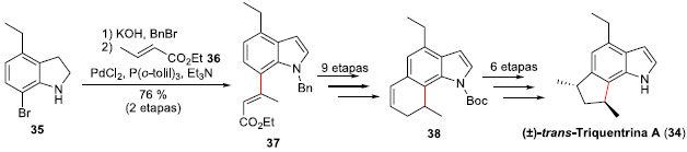 Outro exemplo de síntese de produto natural, utilizando o acoplamento Heck, foi a síntese total racêmica diastereosseletiva da (±)-trans-Triquentrina A (34), um produto natural marinho que foi isolado a partir da esponja Trikentrion flabelliforme em 1986.36 Realizada em 2008 pelo grupo do professor Silva Jr. na USP/SP,37 o acoplamento Heck foi executado entre o bromo-indol 35 e o crotonato de etila (36), fornecendo o éster insaturado 37, com controle da configuraçao E da olefina (Esquema 10). Esta olefina foi importante para assegurar a síntese do intermediário avançado 38, o qual sofreu reaçao de contraçao de anel mediada por tálio (III), levando posteriormente à consecuçao da síntese total da (±)-trans-Triquentrina A (34) em 21 etapas e apenas 2% de rendimento global.